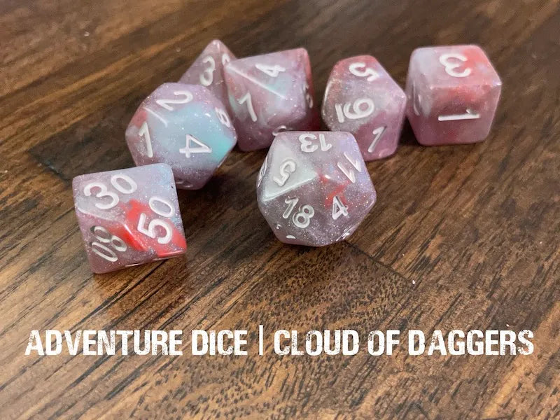 Cloud of Daggers polyhedral dice set are translucent sparkly grey with wisps of red and pale blue, with silver numbering.