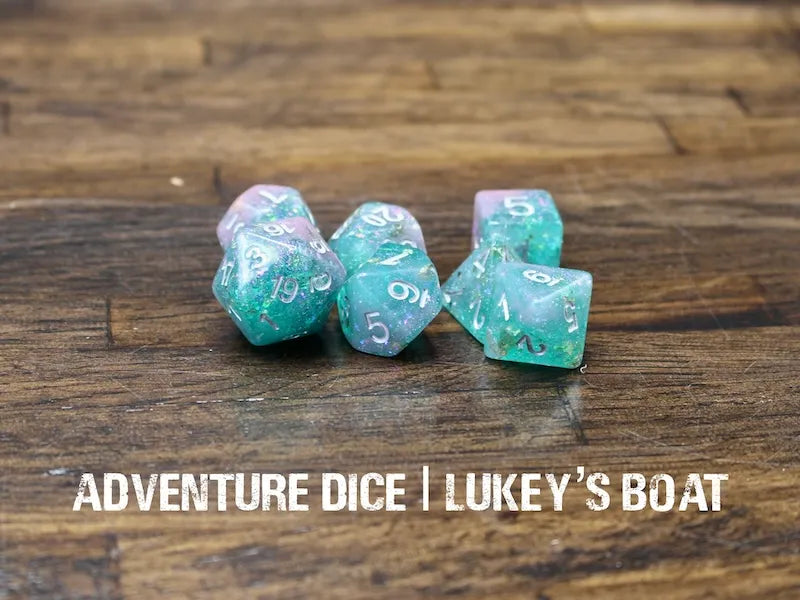 Lukey’s Boat RPG dice set are translucent green with pink wisps, holographic sparkles and gold foil, and silver numbers.