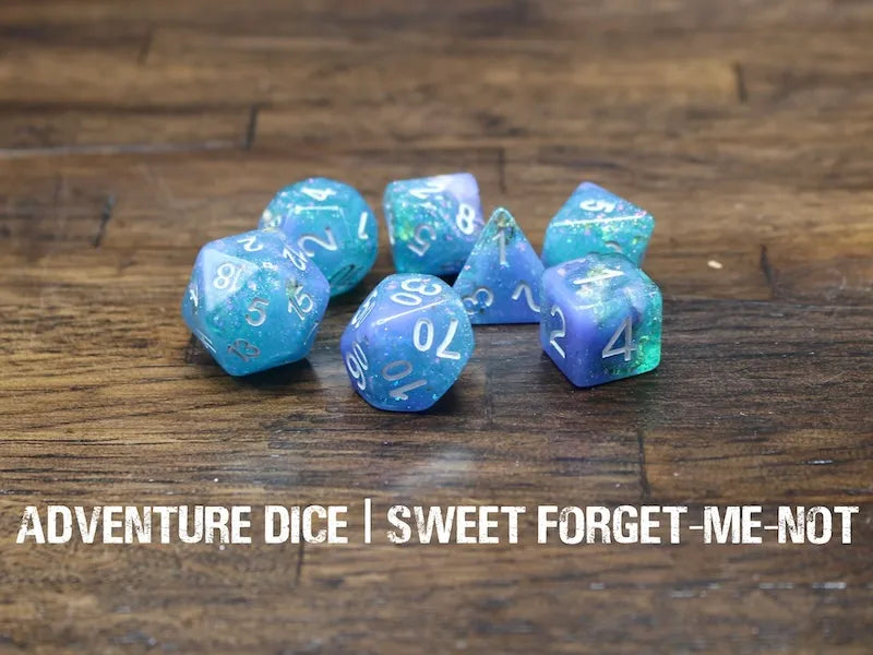 Sweet Forget-Me-Not RPG dice set are a swirl of transparent sparkly green and opaque blue with gold foil flakes, and silver numbering.