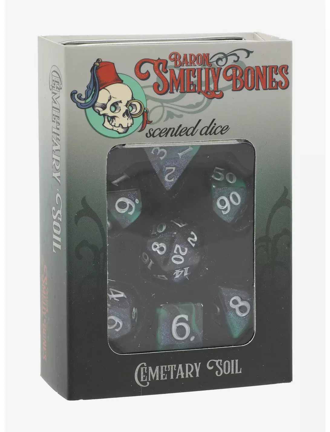 These ominous dice are transparent black with iridescent glitter swirled with opaque green curls, just like my skull!