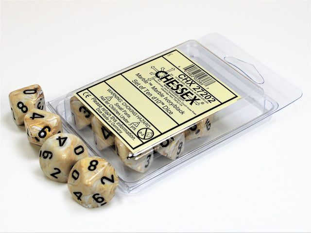 Contains 10 Marble Ivory d10 dice with black numbers (PM1092) in Plastic Clamshell.