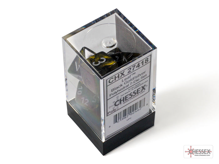This set contains 7 Leaf Black Gold dice with silver numbers with the following shapes: