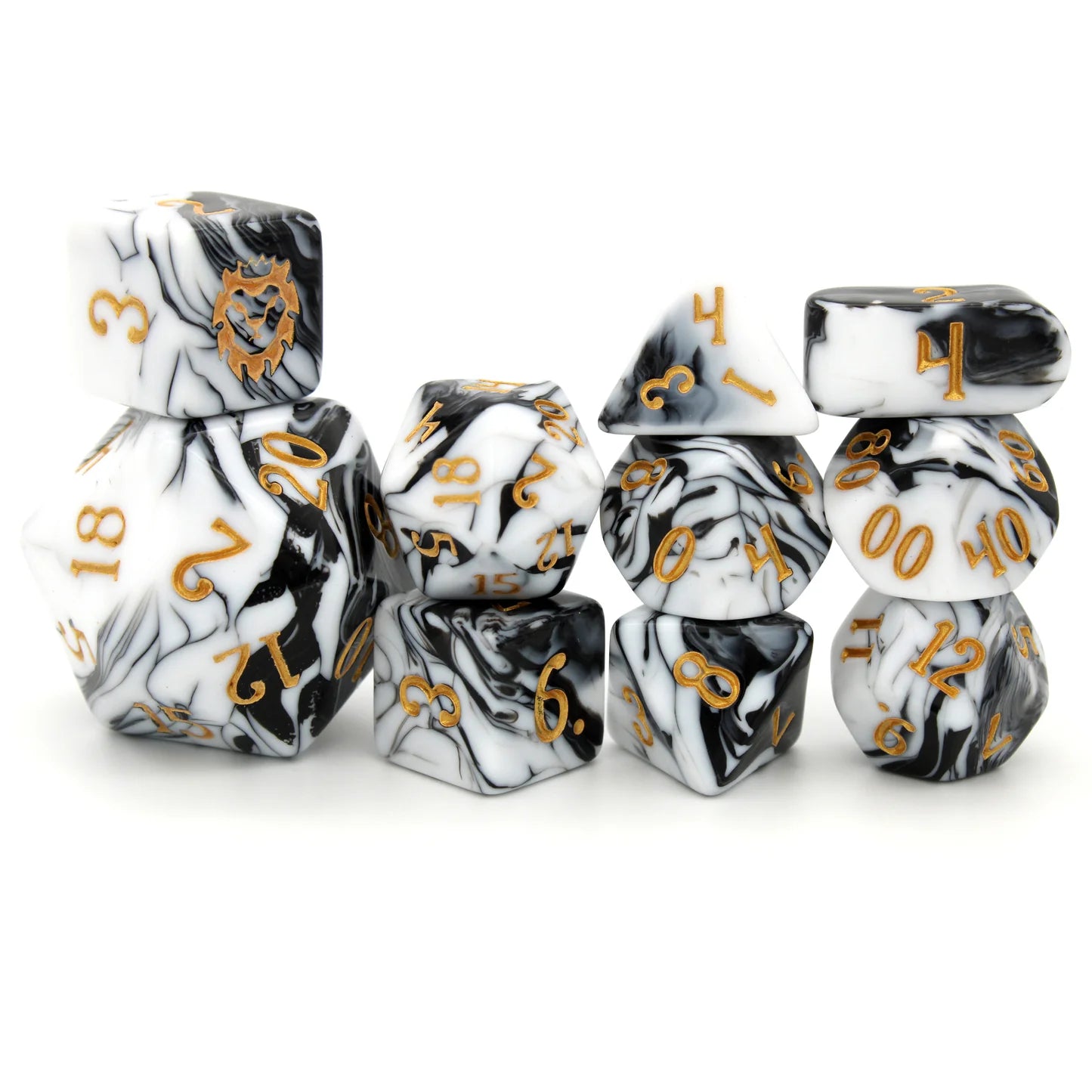 Nothing says elegance and poise quite like monochromatic marble crowned with gilded numerals. Reminiscent of the homes of the Real Housewives of Neverwinter, these luxurious dice offer all the beauty of a fantasy trophy spouse with none of the upkeep and for a fraction of the cost.