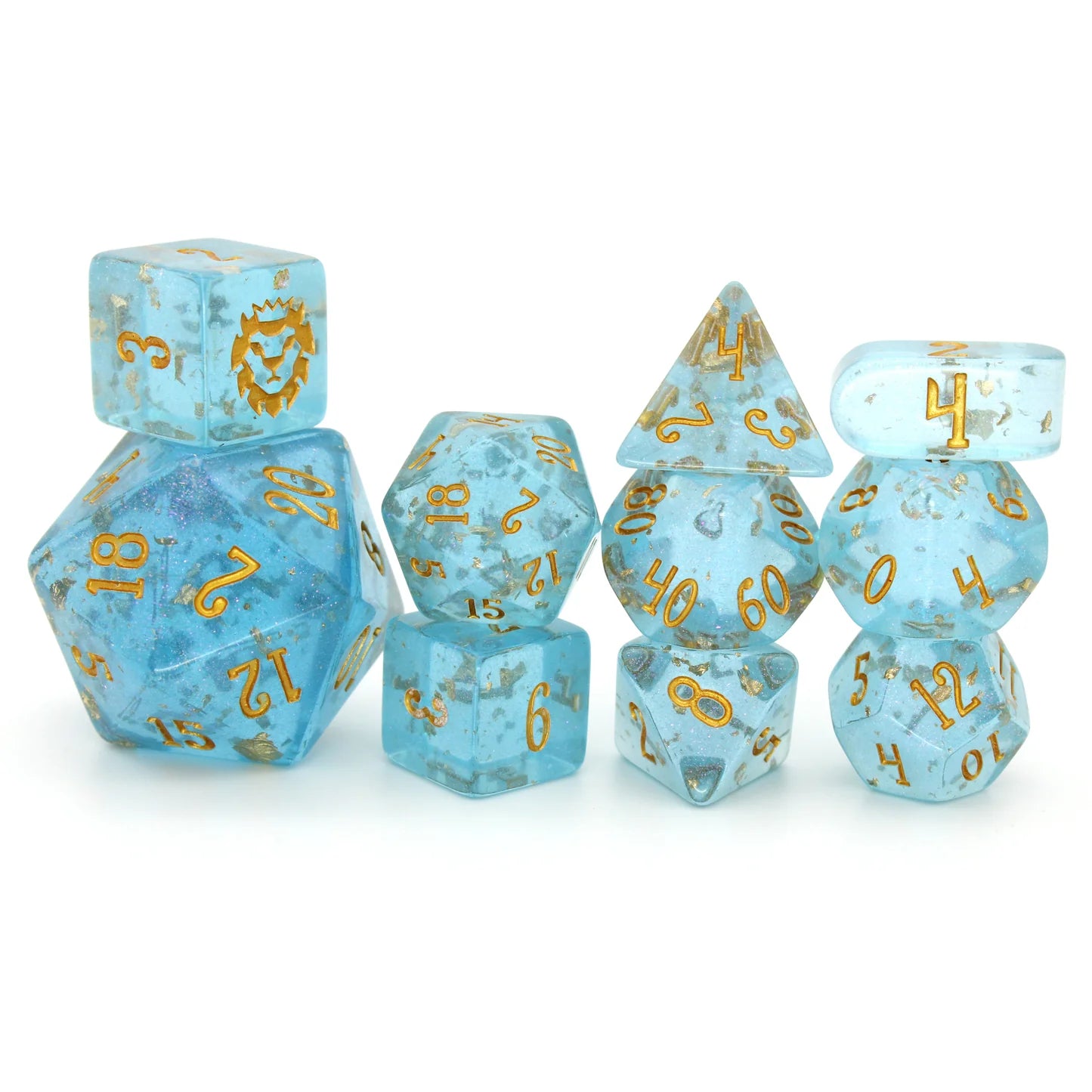 Celesteal is a bright blue 10-piece resin set with gold flake inclusions, pink micro glitter, and gold ink.