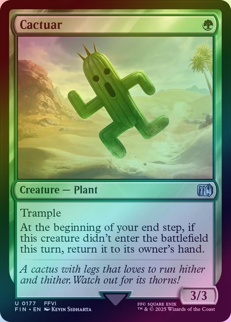 CactuarCasting Cost: Card Type: Creature - PlantPower/Toughness: 3/3Card Text: Trample At the beginning of your end step, if this creature didn't enter the battlefield this turn, return it to its owner's hand.Flavour Text: A cactus with legs that loves to run hither and thither. Watch out for its thorns!Artist: Kevin Sidharta