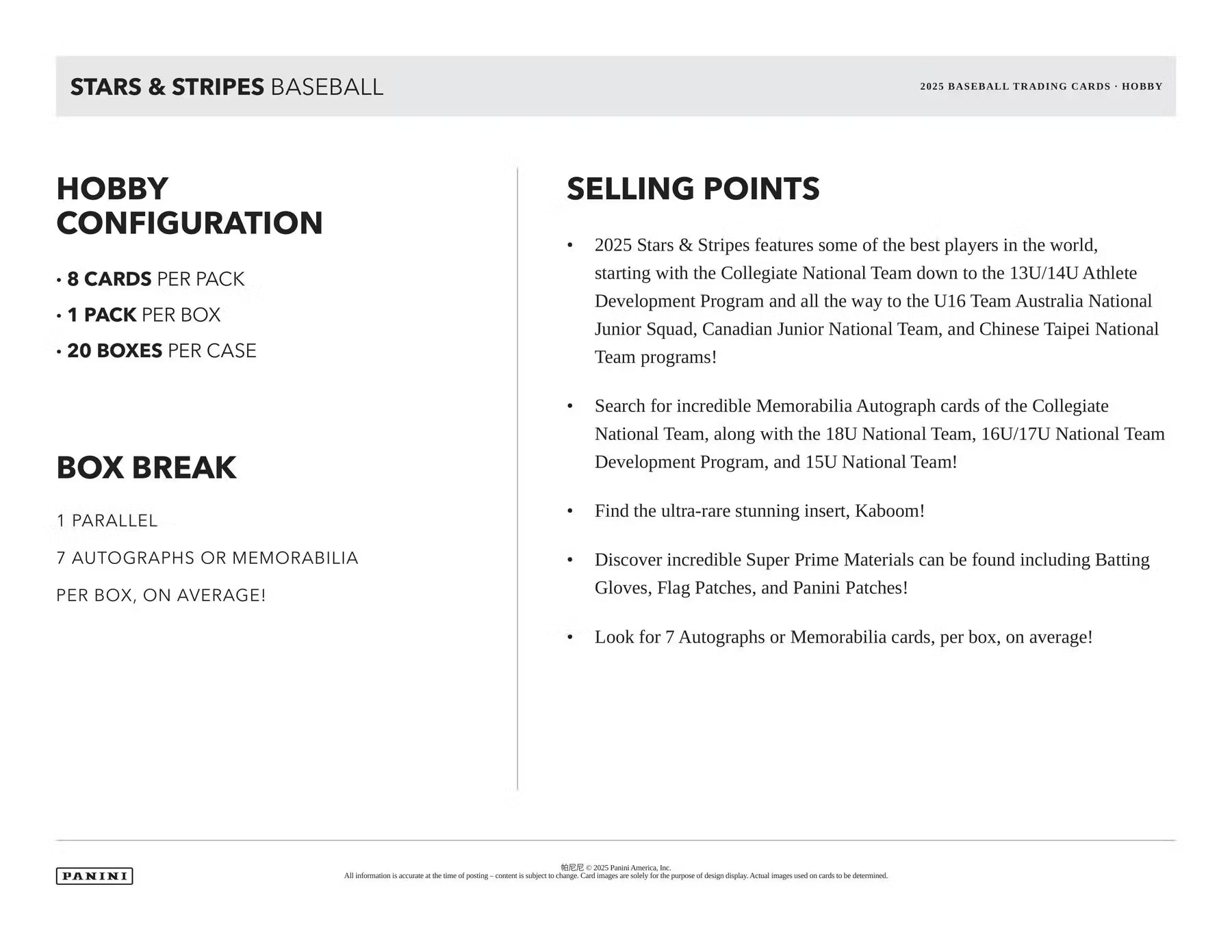 Find an array of incredible cards in 2025 Stars & Stripes, featuring the Ultra-Rare Kaboom! insert, incredible memorabilia cards in Jumbo Materials, and the astonishing Future Is Now card, featuring 8 Autographs from the top names in USA Baseball!