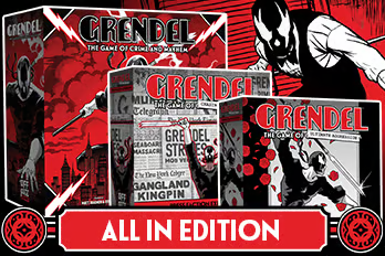 Designed by Sen-Foong Lim (MIND MGMT, Corps of Discovery) and Alara Cameron (Kingdom Rush, Clans of Midgard), and new art from Grendel creator, Matt Wagner, this competitive 1-4 player game has you playing as the deadly assassin, Grendel, the Mob, the Police, or the wolf creature, Argent as they each battle for control over New York City.