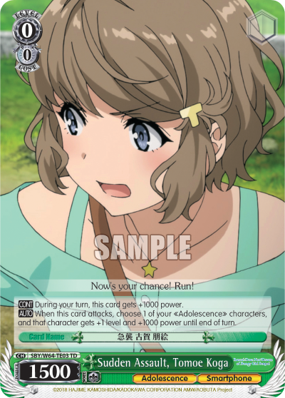 Sudden Assault, Tomoe Koga - SBY/W64-TE03 - Trial Deck and more Weiss Schwarz Singles from Rascal Does Not Dream of Bunny Girl Senpai are available now at 401 Games!