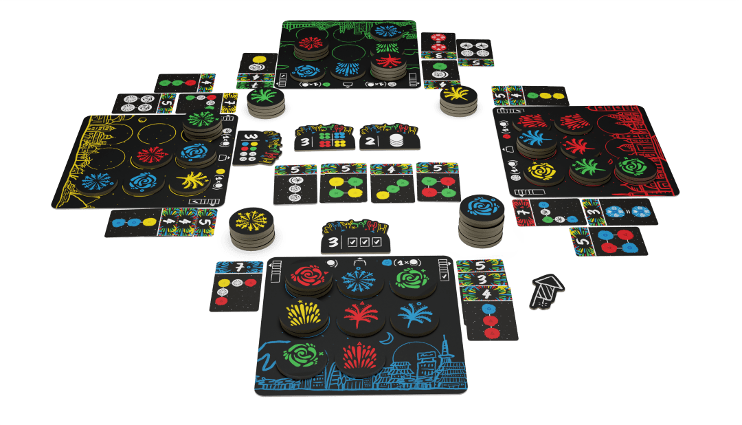 Whenever a player has completed six objectives or a stack of firework tiles has run out, the game concludes at the end of the round. In addition to scoring completed objectives and claimed crowd-pleasers, you have a target color and firework type depicted on your board. Each tile of this color or type at the top of a stack on your board is worth as many points as the number of tiles in that stack. If a tile matches both color and type, you score it twice.