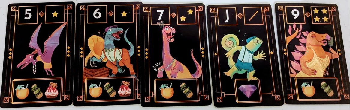 Your goal is to have the most points at game's end. Each dino is worth 1-5 points on its own, with pairs and triplets being worth 3 and 6 points. That said, you can choose to discard an acquired dino if it's a duplicate in order to transform your "Mine!" card into a joker. Why would you want to do that? Because sequences of dinos are also worth points, with six in a row being worth 15 points, for example.