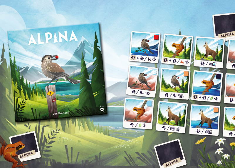 In Alpina, you explore the Swiss National Park with a camera around your neck to photograph animals in their natural habitat. The spotted nutcracker, grass frogs, and more are waiting for you and offer you a unique opportunity to collect points in an original way that is related to the landscape and interaction with your neighbors. Do you play a card to score more points, or do you use the opportunity to deceive your opponents? Find the card that allows you to strike a balance between these two objectives, and victory will be yours!