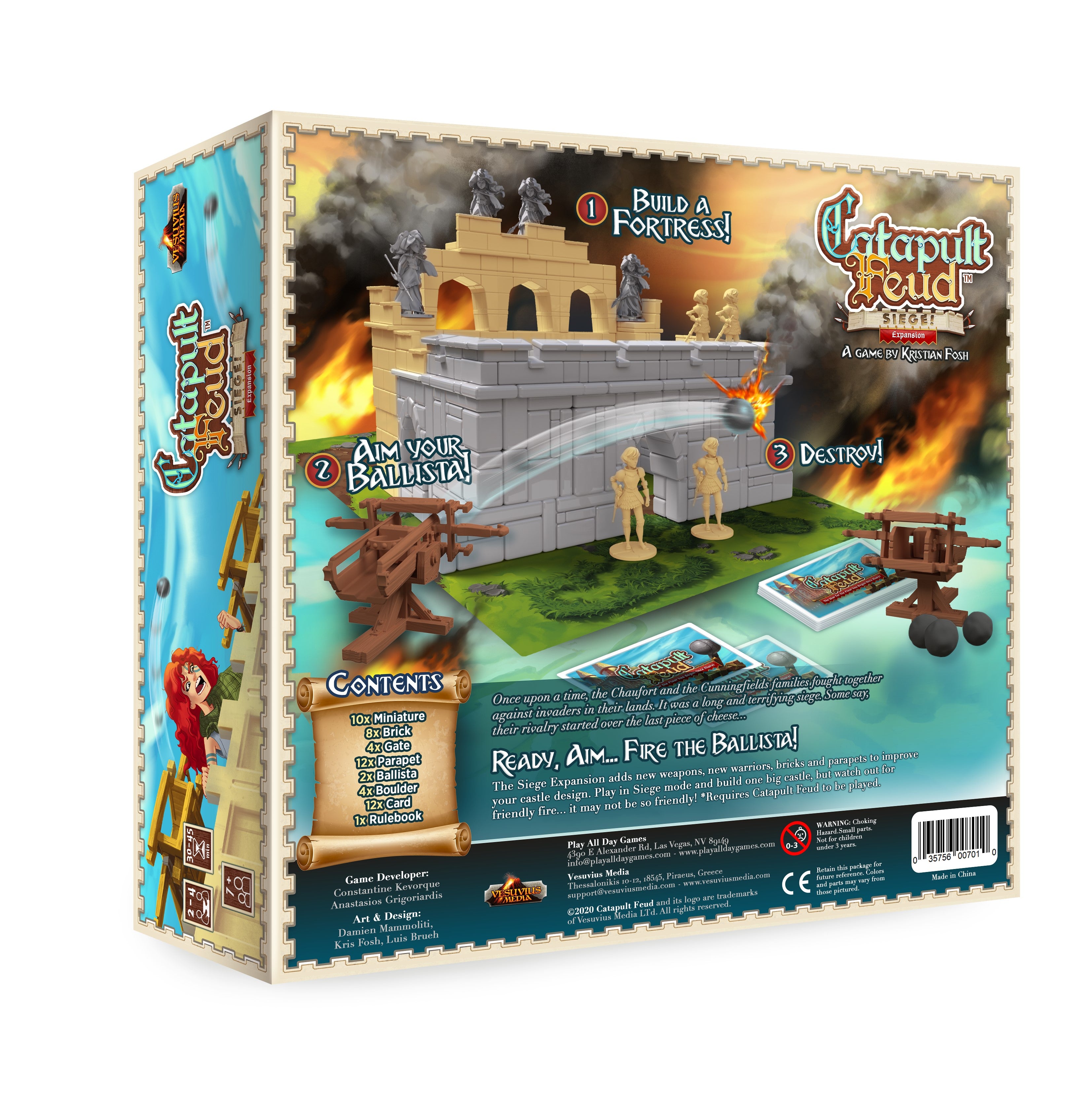 Catapult Feud Siege Expansion includes a new weapon (ballista), new troops, new strategy cards and new bricks so you can create even more impressive castles!