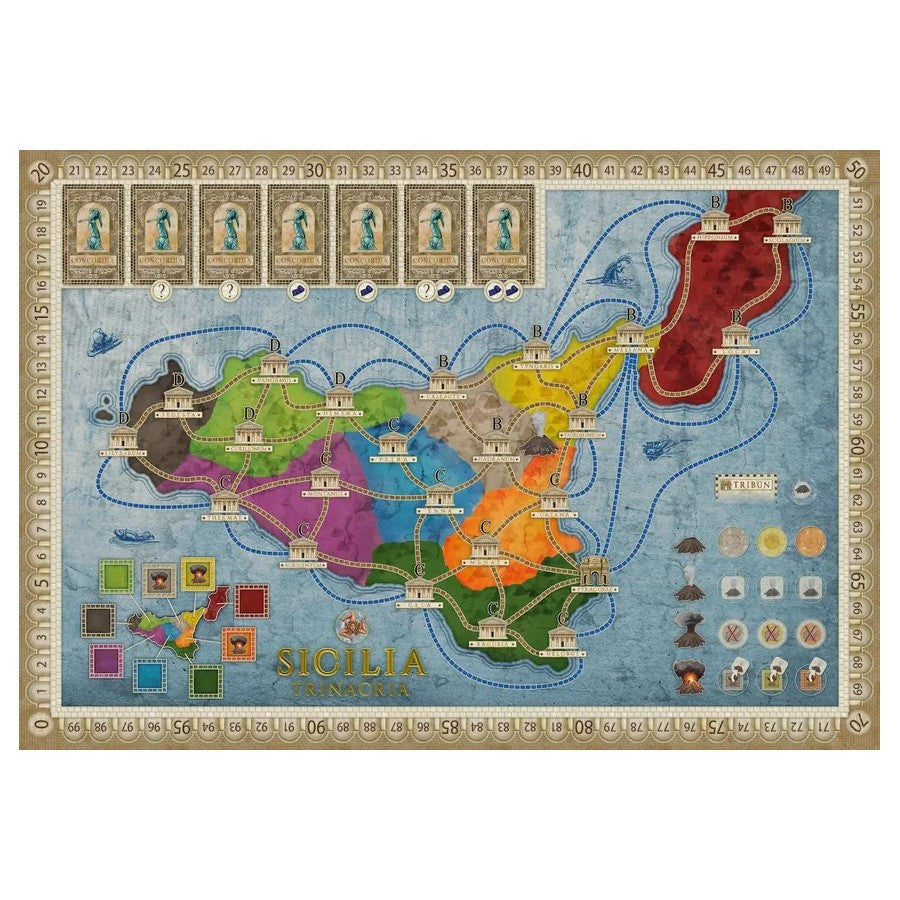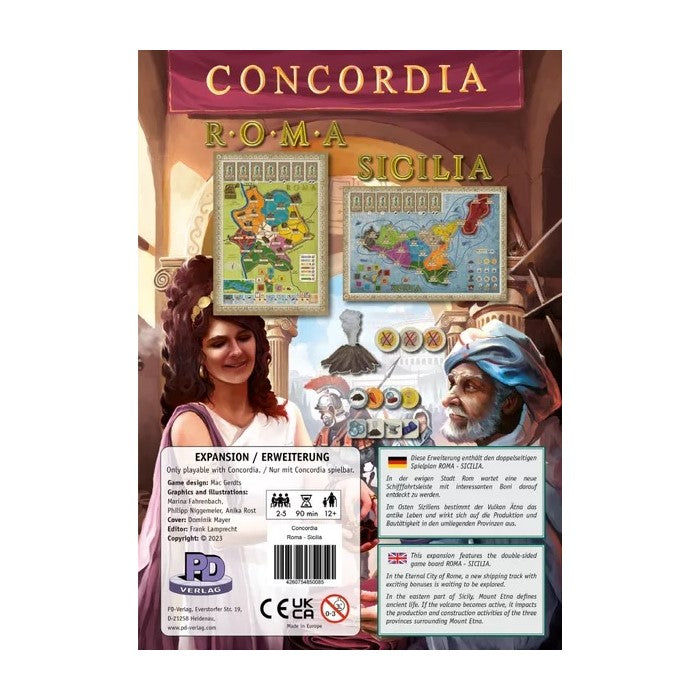 Concordia: Roma/Sicilia is an expansion for Concordia that provides a double-sided game board for two different experiences: