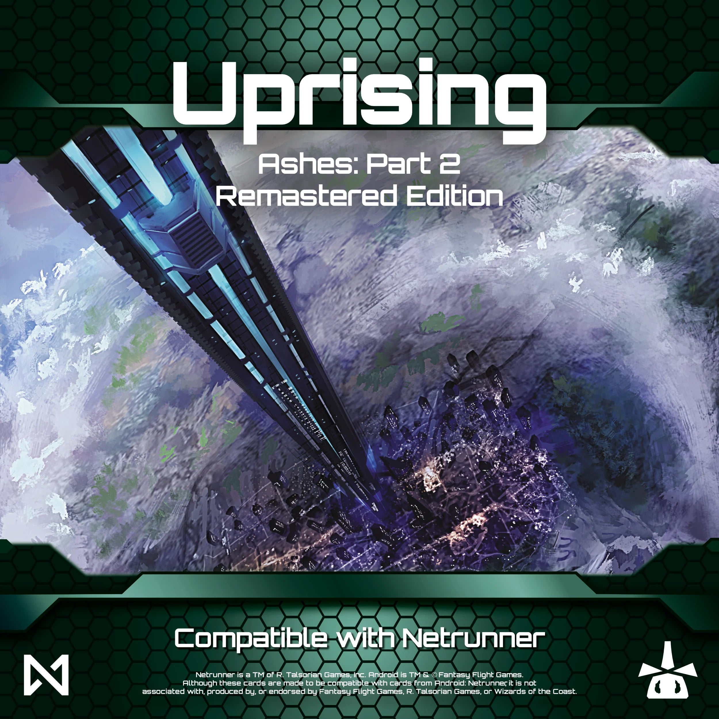 Uprising is a 65-card expansion and the second half of the Ashes Cycle. While expanding on the designs of Downfall, it also introduces new ideas like lockdowns—powerful Corp operations that dissuade the Runner for an entire turn.