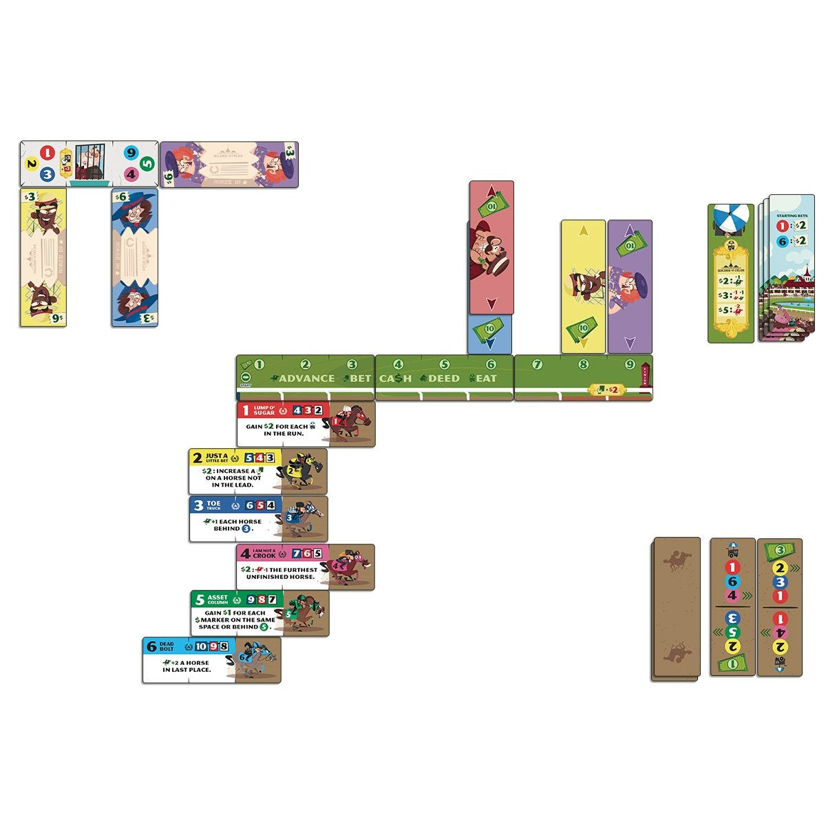 Each round, the Run cards advance 3 horses and players take turns performing an Action. After 3 horses finish the race, players add up their winnings to see who won the most cash.