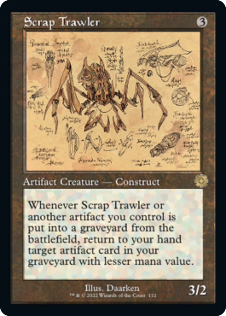 Scrap TrawlerCasting Cost: Card Type: Artifact Creature - ConstructPower/Toughness: 3/2Card Text: Whenever Scrap Trawler or another artifact you control is put into a graveyard from the battlefield, return to your hand target artifact card in your graveyard with lesser mana value.Artist: Daarken