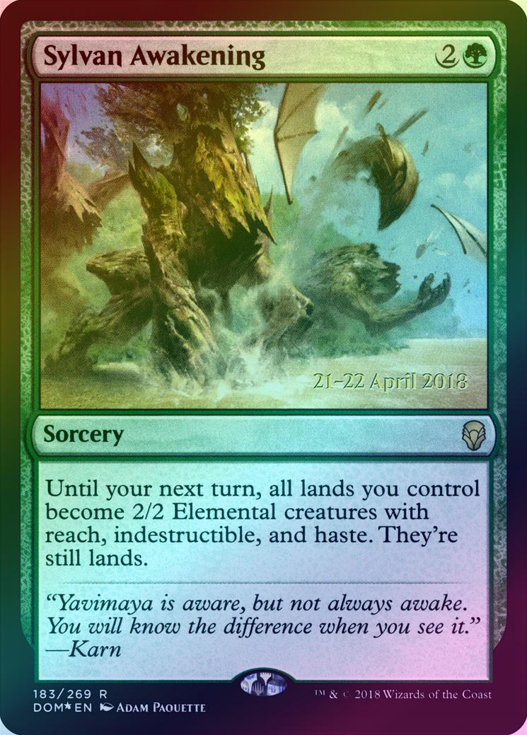 Sylvan AwakeningCasting Cost: Card Type: SorceryCard Text: Until your next turn, all lands you control become 2/2 Elemental creatures with reach, indestructible, and haste. They're still lands.Flavour Text: "Yavimaya is aware, but not always awake. You will know the difference when you see it." -KarnArtist: Adam Paquette