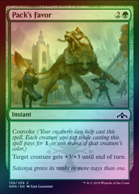 p>Pack's FavorCasting Cost: Card Type: InstantCard Text: Convoke (Your creatures can help cast this spell. Each creature you tap while casting this spell pays for or one mana of that creature's color.) Target creature gets +3/+3 until end of turn.Flavour Text: Selesnya grows its ranks in more ways than one.Artist: Lius LasahidoRarity: Common