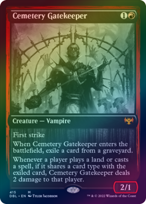Cemetery GatekeeperCasting Cost: Card Type: Creature - VampirePower/Toughness: 2/1Card Text: First strike When Cemetery Gatekeeper enters the battlefield, exile a card from a graveyard. Whenever a player plays a land or casts a spell, if it shares a card type with the exiled card, Cemetery Gatekeeper deals 2 damage to that player.Artist: Tyler Jacobson