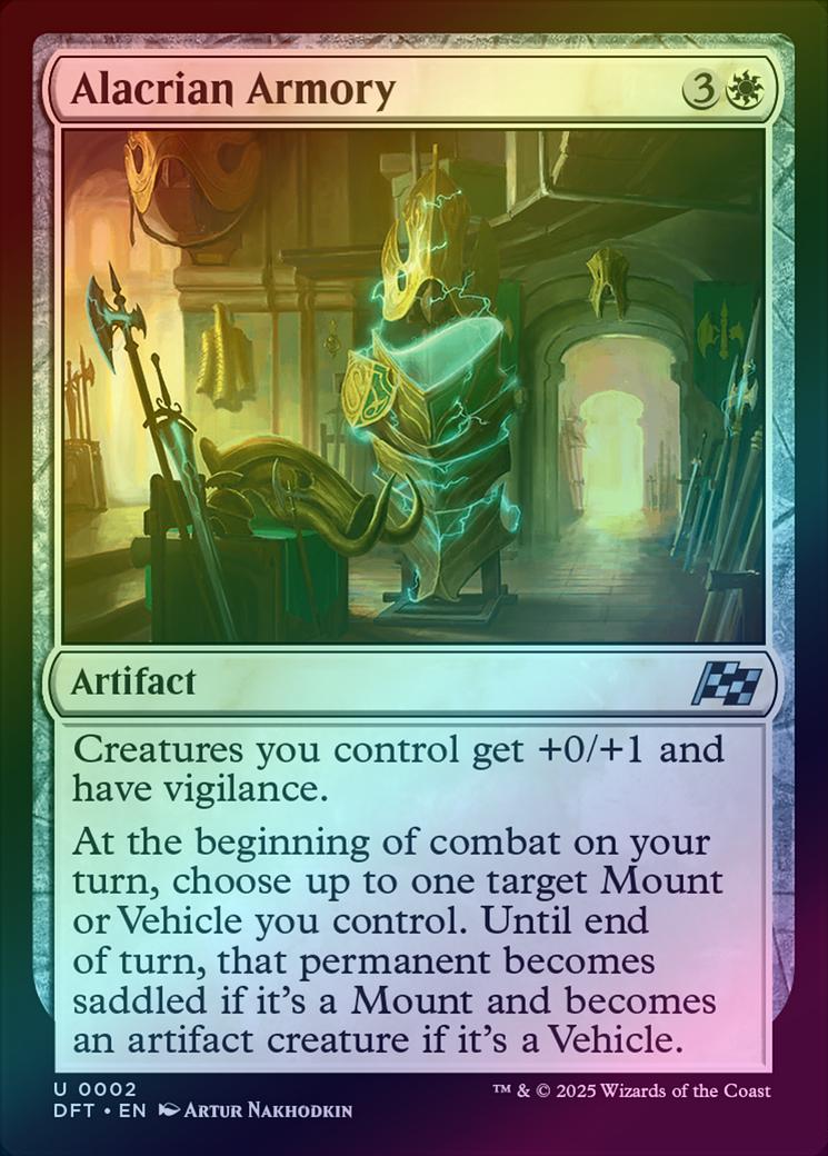 Alacrian ArmoryCasting Cost: Card Type: ArtifactCard Text: Creatures you control get +0/+1 and have vigilance. At the beginning of combat on your turn, choose up to one target Mount or Vehicle you control. Until end of turn, that permanent becomes saddled if it's a Mount and becomes an artifact creature if it's a Vehicle.Artist: Artur Nakhodkin