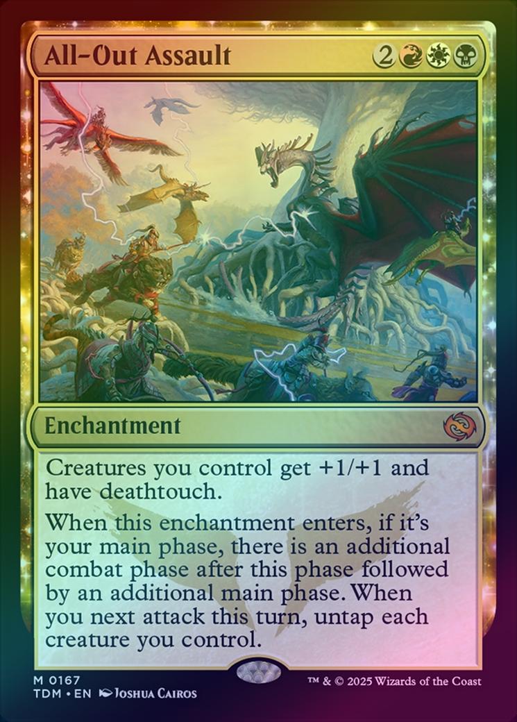 All-Out AssaultCasting Cost: Card Type: EnchantmentCard Text: Creatures you control get +1/+1 and have deathtouch. When this enchantment enters, if it's your main phase, there is an additional combat phase after this phase followed by an additional main phase. When you next attack this turn, untap each creature you control.Artist: Joshua Cairos