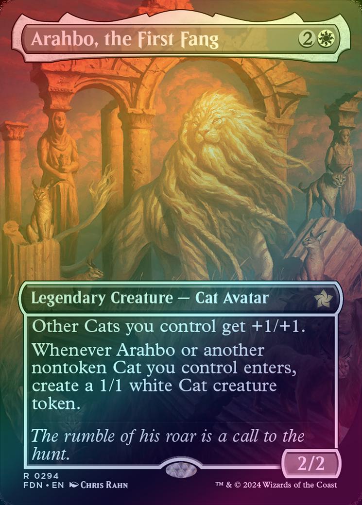Arahbo, the First FangCasting Cost: Card Type: Legendary Creature - Cat AvatarPower/Toughness: 2/2Card Text: Other Cats you control get +1/+1. Whenever Arahbo or another nontoken Cat you control enters, create a 1/1 white Cat creature token.Flavour Text: The rumble of his roar is a call to the hunt.Artist: Chris Rahn