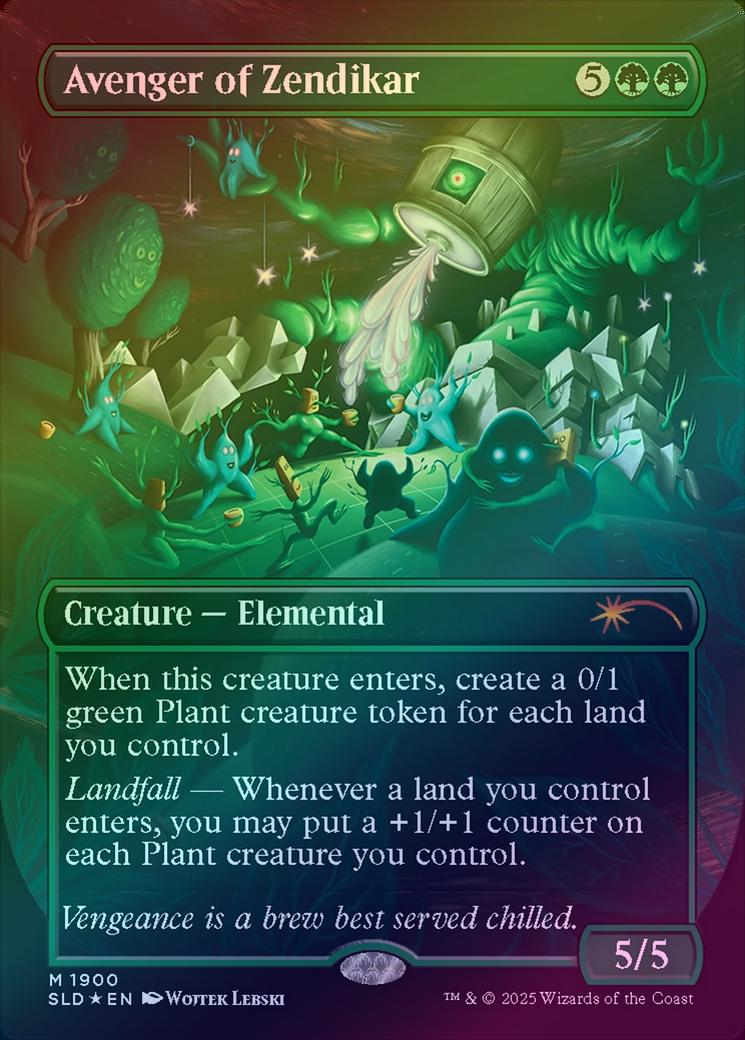 Avenger of ZendikarCasting Cost: Card Type: Creature - ElementalPower/Toughness: 5/5Card Text: When this creature enters, create a 0/1 green Plant creature token for each land you control. Landfall - Whenever a land you control enters, you may put a +1/+1 counter on each Plant creature you control.Flavour Text: Vengeance is a brew best served chilled.Artist: Wojtek ebski