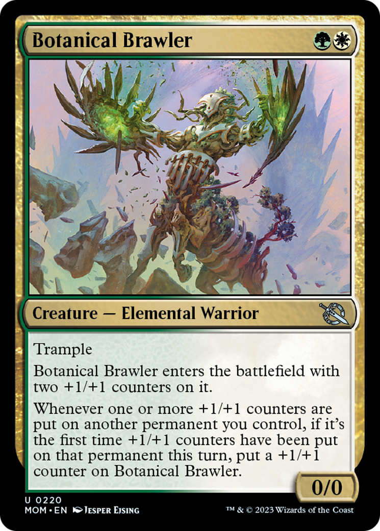 Botanical BrawlerCasting Cost: Card Type: Creature - Elemental WarriorPower/Toughness: 0/0Card Text: Trample Botanical Brawler enters the battlefield with two +1/+1 counters on it. Whenever one or more + 1/+ 1 counters are put on another permanent you control, if it's the first time + 1/+1 counters have been put on that permanent this turn, put a +1/+1 counter on Botanical Brawler.Artist: Jesper Ejsing