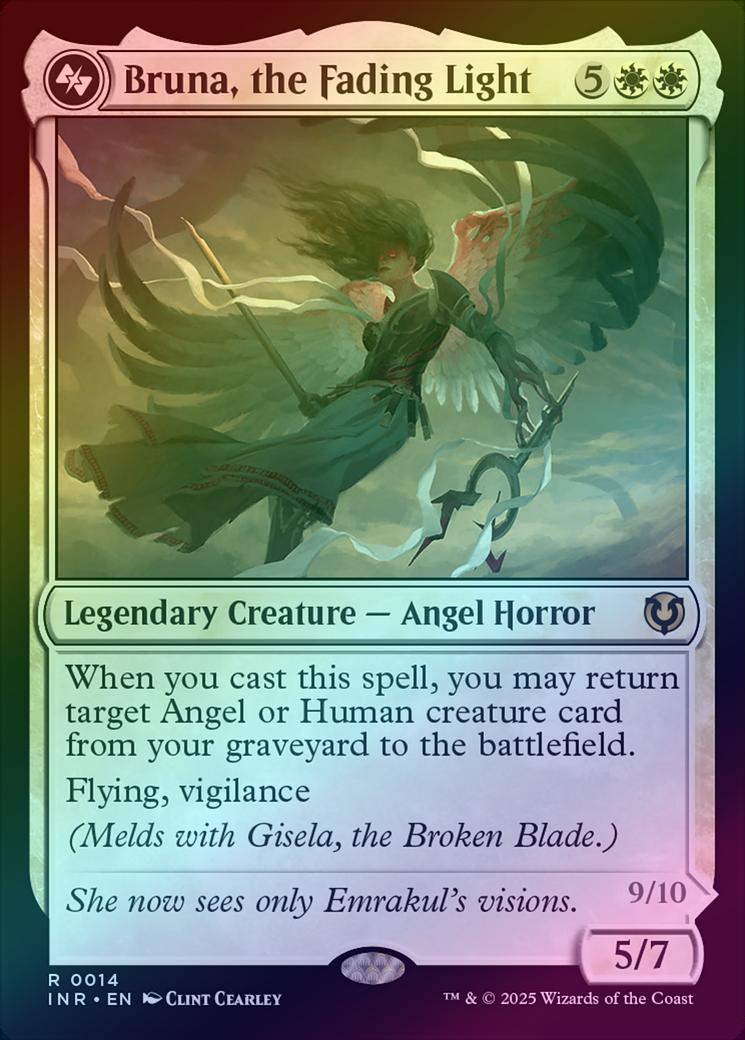 Bruna, the Fading LightCasting Cost: Card Type: Legendary Creature - Angel HorrorPower/Toughness: 5/7Card Text: When you cast this spell, you may return target Angel or Human creature card from your graveyard to the battlefield. Flying, vigilance (Melds with Gisela, the Broken Blade.)Flavour Text: She now sees only Emrakul's visions.Artist: Clint Cearley
