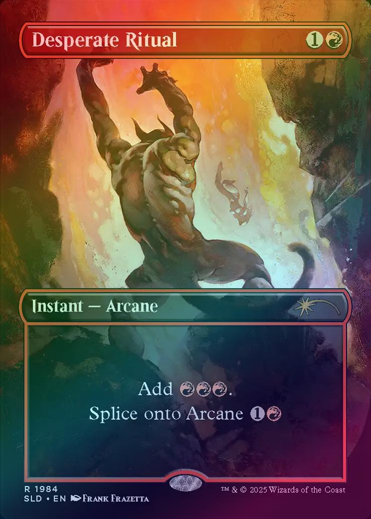 Desperate RitualCasting Cost: Card Type: Instant - ArcaneCard Text: Add . Splice onto Arcane (As you cast an Arcane spell, you may reveal this card from your hand and pay its splice cost. If you do, add this card's effects to that spell.)Artist: Frank Frazetta