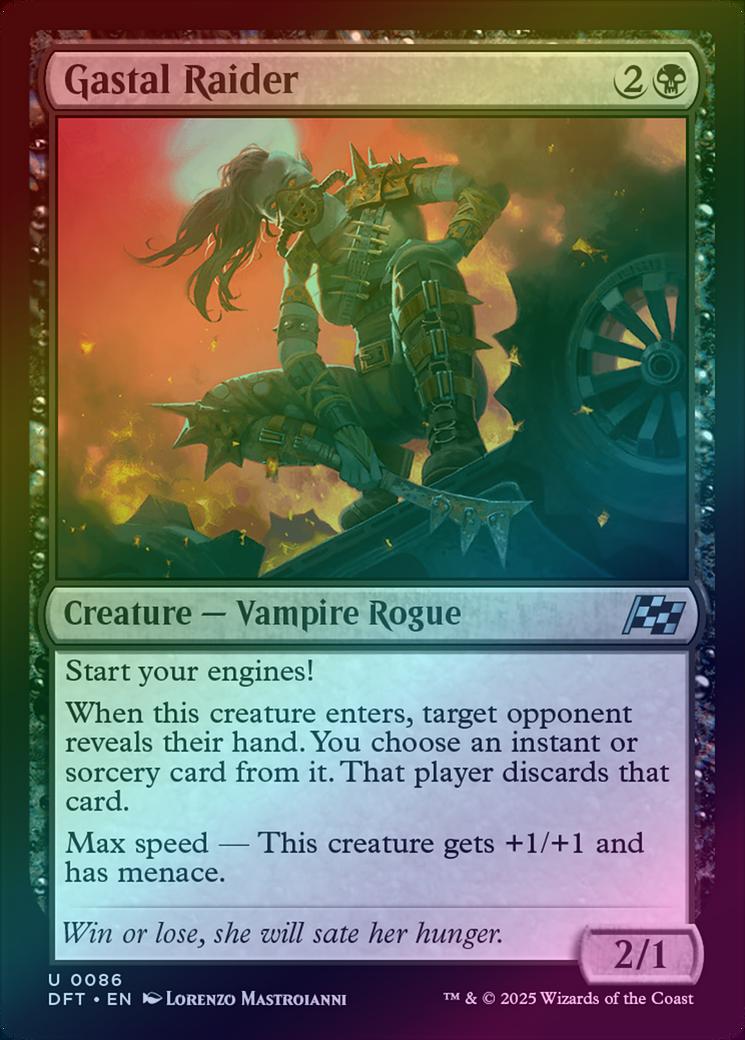 Gastal RaiderCasting Cost: Card Type: Creature - Vampire RoguePower/Toughness: 2/1Card Text: Start your engines! When this creature enters, target opponent reveals their hand. You choose an instant or sorcery card from it. That player discards that card. Max speed - This creature gets +1/+1 and has menace.Flavour Text: Win or lose, she will sate her hunger.Artist: Lorenzo Mastroianni