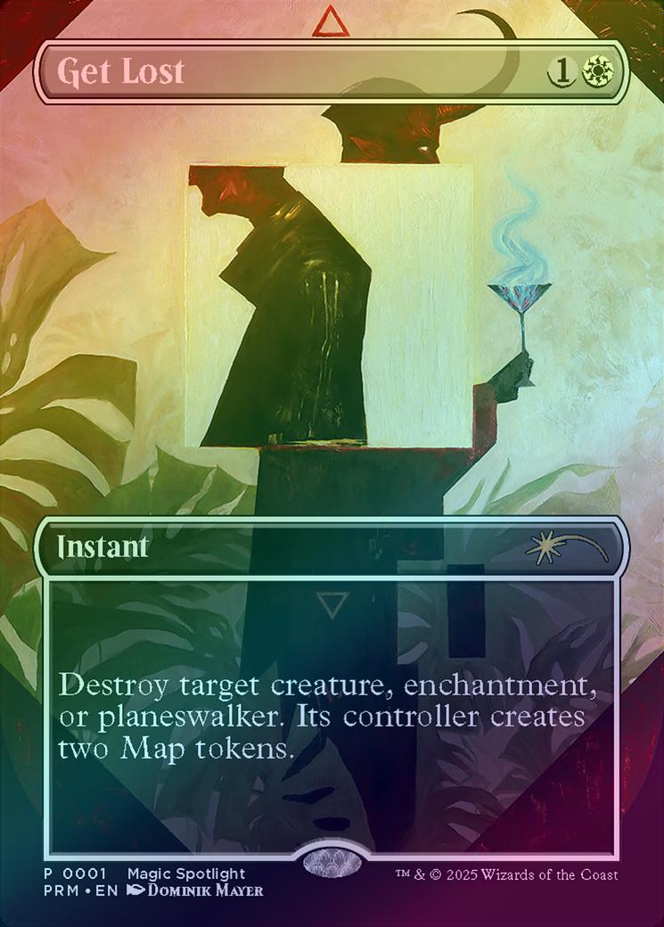 Get LostCasting Cost: Card Type: InstantCard Text: Destroy target creature, enchantment, or planeswalker. Its controller creates two Map tokens. (They're artifacts with ", , Sacrifice this token: Target creature you control explores. Activate only as a sorcery.")Artist: Dominik Mayer