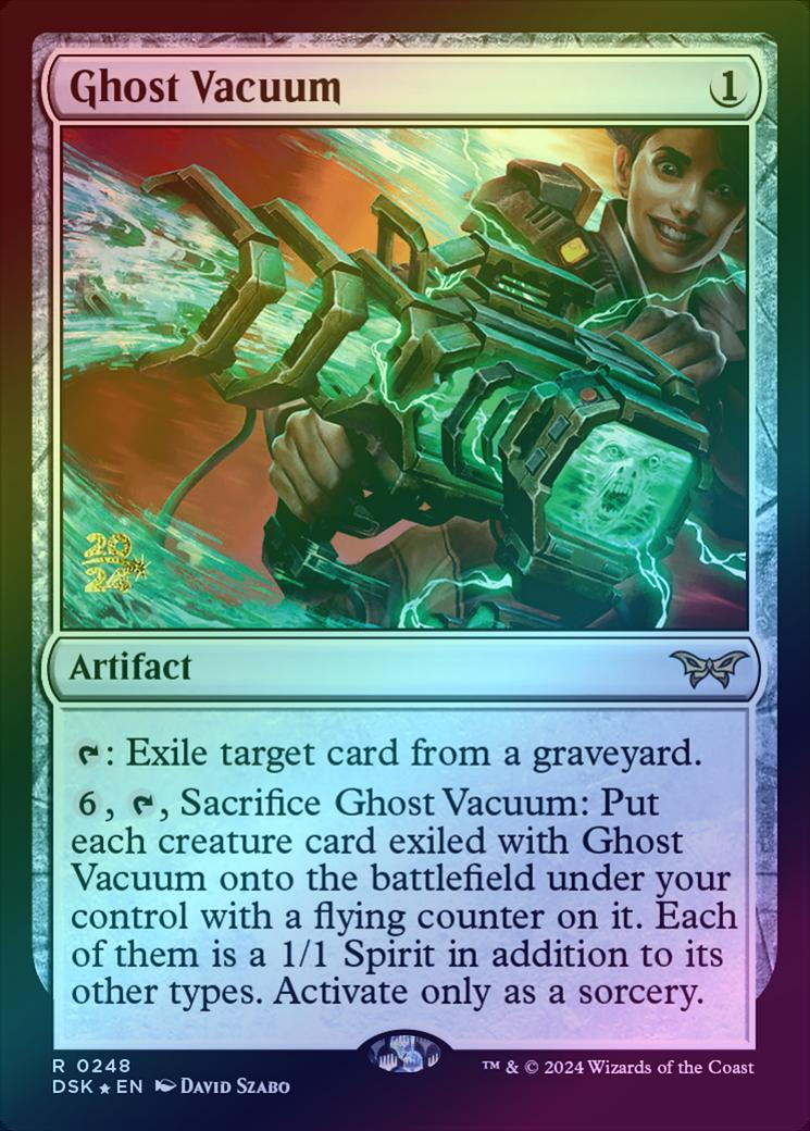 Ghost VacuumCasting Cost: Card Type: ArtifactCard Text: : Exile target card from a graveyard. , , Sacrifice Ghost Vacuum: Put each creature card exiled with Ghost Vacuum onto the battlefield under your control with a flying counter on it. Each of them is a 1/1 Spirit in addition to its other types. Activate only as a sorcery.Artist: David Szabo