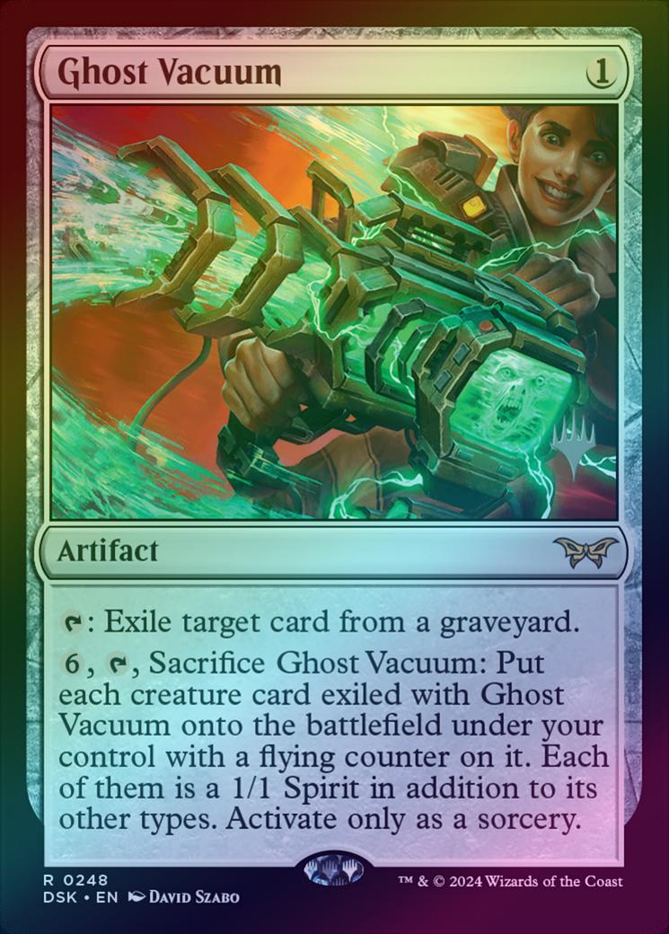 Ghost VacuumCasting Cost: Card Type: ArtifactCard Text: : Exile target card from a graveyard. , , Sacrifice Ghost Vacuum: Put each creature card exiled with Ghost Vacuum onto the battlefield under your control with a flying counter on it. Each of them is a 1/1 Spirit in addition to its other types. Activate only as a sorcery.Artist: David Szabo