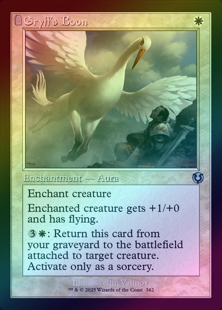 Gryff's BoonCasting Cost: Card Type: Enchantment - AuraCard Text: Enchant creature Enchanted creature gets +1/+0 and has flying. : Return Gryff's Boon from your graveyard to the battlefield attached to target creature. Activate only as a sorcery.Artist: Svetlin Velinov