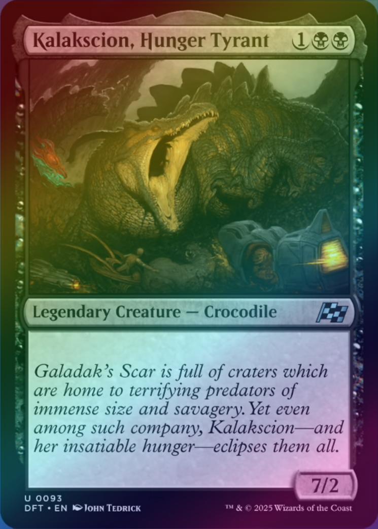 Kalakscion, Hunger TyrantCasting Cost: Card Type: Legendary Creature - CrocodilePower/Toughness: 7/2Flavour Text: Galadak's Scar is full of craters which are home to terrifying predators of immense size and savagery. Yet even among such company, Kalakscion-and her insatiable hunger-eclipses them all.Artist: John Tedrick