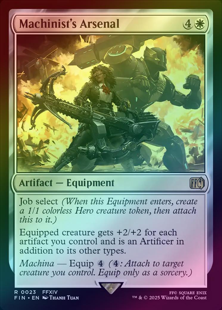 Machinist's ArsenalCasting Cost: Card Type: Artifact - EquipmentCard Text: Job select (When this Equipment enters, create a 1/1 colorless Hero creature token, then attach this to it.) Equipped creature gets +2/+2 for each artifact you control and is an Artificer in addition to its other types. Machina - Equip (: Attach to target creature you control. Equip only as a sorcery.)Artist: Thanh Tun