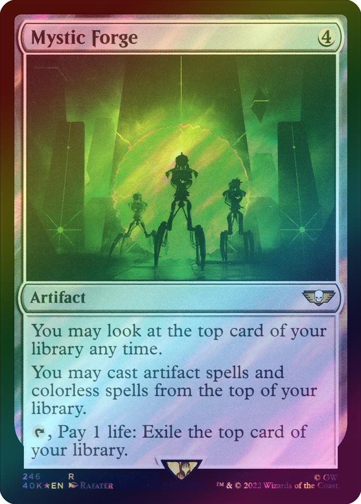 Mystic ForgeCasting Cost: Card Type: ArtifactCard Text: You may look at the top card of your library any time. You may cast artifact spells and colorless spells from the top of your library. , Pay 1 life: Exile the top card of your library.Artist: Rafater