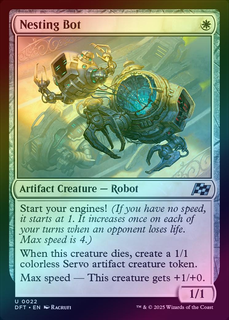 Nesting BotCasting Cost: Card Type: Artifact Creature - RobotPower/Toughness: 1/1Card Text: Start your engines! (If you have no speed, it starts at 1. It increases once on each of your turns when an opponent loses life. Max speed is 4.) When this creature dies, create a 1/1 colorless Servo artifact creature token. Max speed - This creature gets +1/+0.Artist: Racrufi