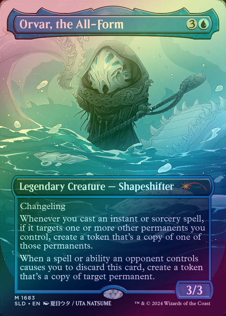 Orvar, the All-FormCasting Cost: Card Type: Legendary Creature - ShapeshifterPower/Toughness: 3/3Card Text: Changeling Whenever you cast an instant or sorcery spell, if it targets one or more other permanents you control, create a token that's a copy of one of those permanents. When a spell or ability an opponent controls causes you to discard this card, create a token that's a copy of target permanent.Artist: Uta Natsume