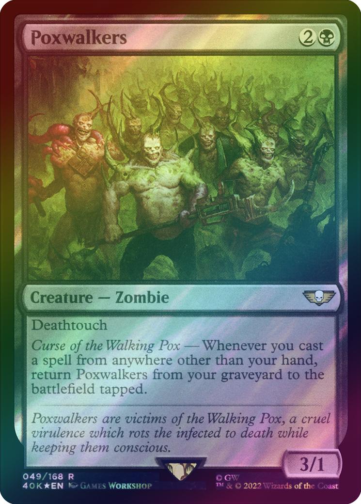 PoxwalkersCasting Cost: Card Type: Creature - ZombiePower/Toughness: 3/1Card Text: Deathtouch Curse of the Walking Pox - Whenever you cast a spell from anywhere other than your hand, return this card from your graveyard to the battlefield tapped.Flavour Text: Poxwalkers are victims of the Walking Pox, a cruel virulence which rots the infected to death while keeping them conscious.Artist: Games Workshop