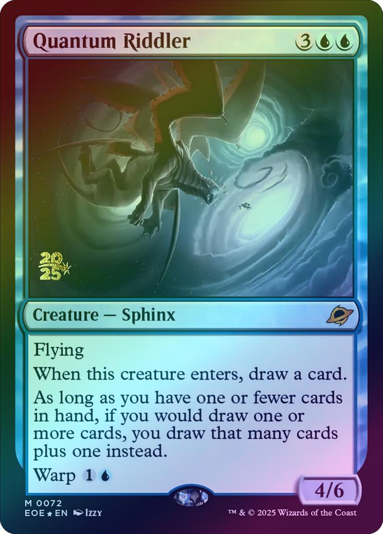 Quantum RiddlerCasting Cost: Card Type: Creature - SphinxPower/Toughness: 4/6Card Text: Flying When this creature enters, draw a card. As long as you have one or fewer cards in hand, if you would draw one or more cards, you draw that many cards plus one instead. Warp Artist: Izzy