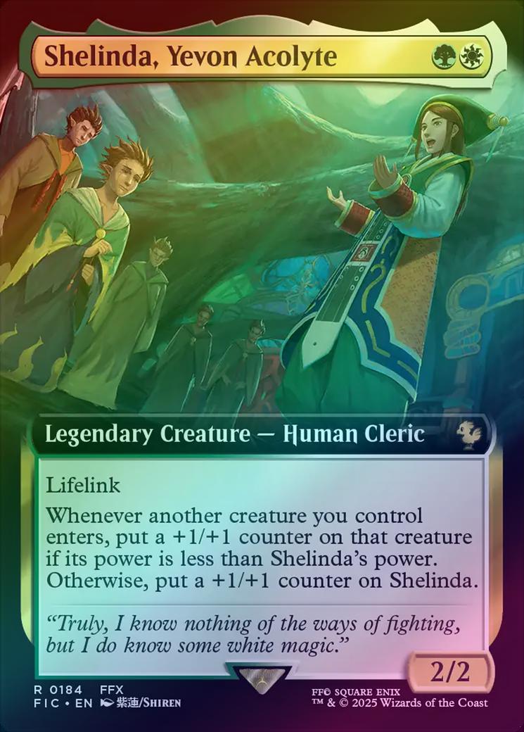 Shelinda, Yevon AcolyteCasting Cost: Card Type: Legendary Creature - Human ClericPower/Toughness: 2/2Card Text: Lifelink Whenever another creature you control enters, put a +1/+1 counter on that creature if its power is less than Shelinda's power. Otherwise, put a +1/+1 counter on Shelinda.Flavour Text: "Truly, I know nothing of the ways of fighting, but I do know some white magic."