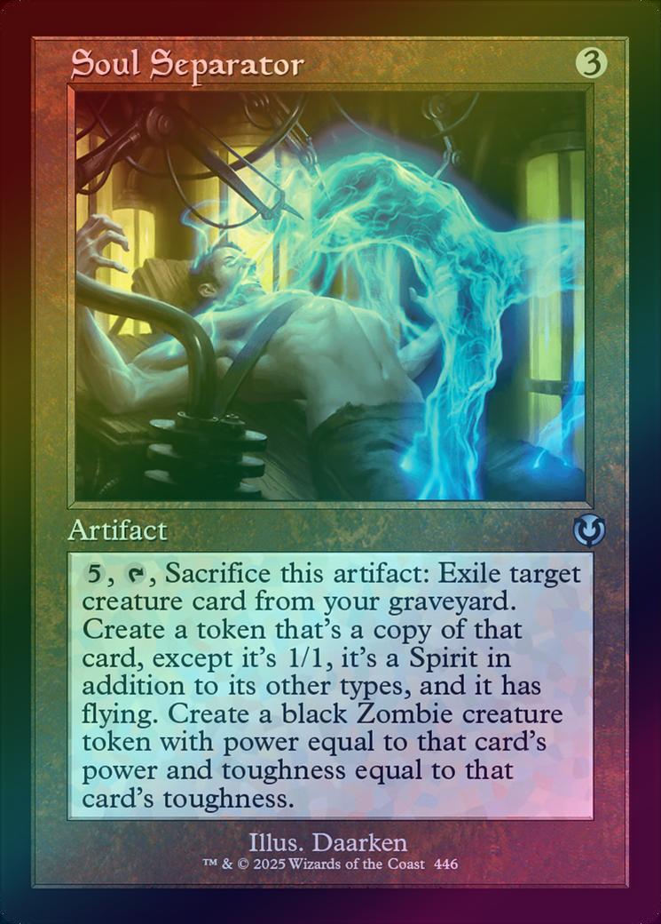 Soul SeparatorCasting Cost: Card Type: ArtifactCard Text: , , Sacrifice Soul Separator: Exile target creature card from your graveyard. Create a token that's a copy of that card, except it's 1/1, it's a Spirit in addition to its other types, and it has flying. Create a black Zombie creature token with power equal to that card's power and toughness equal to that card's toughness.Artist: Daarken