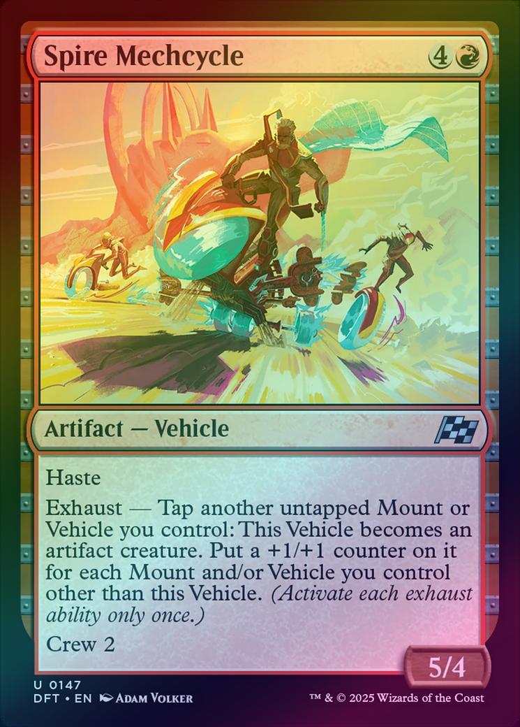 Spire MechcycleCasting Cost: Card Type: Artifact - VehiclePower/Toughness: 5/4Card Text: Haste Exhaust - Tap another untapped Mount or Vehicle you control: This Vehicle becomes an artifact creature. Put a +1/+1 counter on it for each Mount and/or Vehicle you control other than this Vehicle. (Activate each exhaust ability only once.) Crew 2Artist: Adam Volker