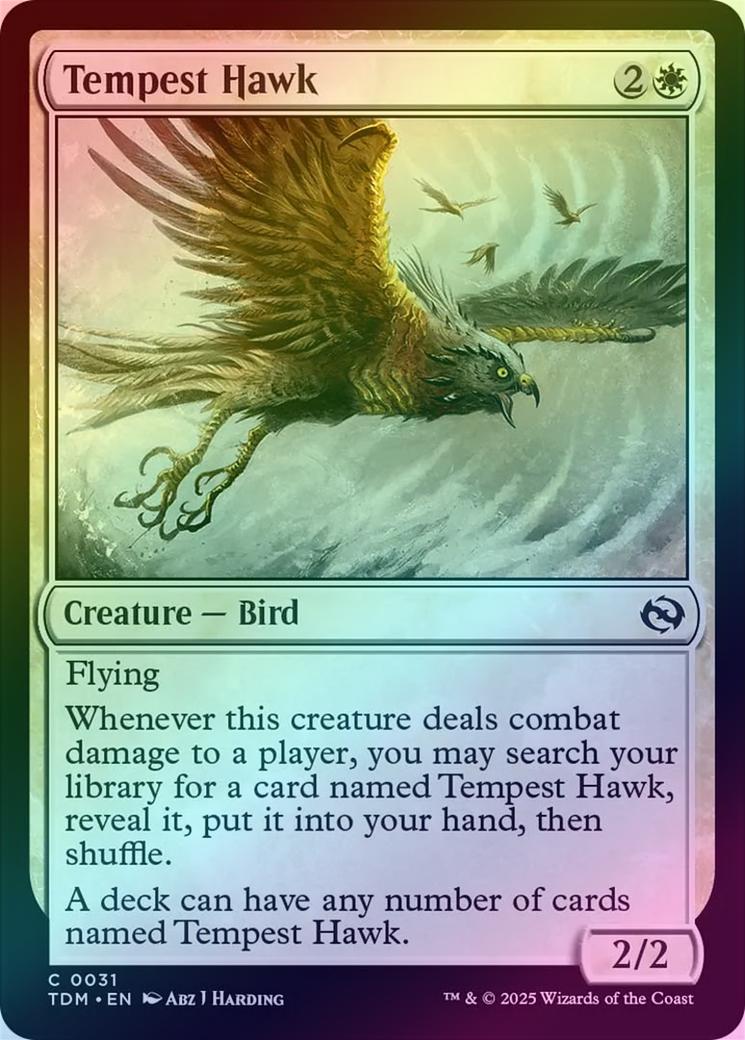 Tempest HawkCasting Cost: Card Type: Creature - BirdPower/Toughness: 2/2Card Text: Flying Whenever this creature deals combat damage to a player, you may search your library for a card named Tempest Hawk, reveal it, put it into your hand, then shuffle. A deck can have any number of cards named Tempest Hawk.Artist: Abz J Harding