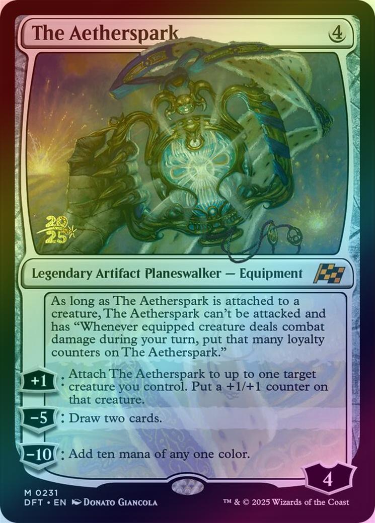 The AethersparkCasting Cost: Card Type: Legendary Artifact Planeswalker - EquipmentLoyalty: 4Card Text: As long as The Aetherspark is attached to a creature, The Aetherspark can't be attacked and has "Whenever equipped creature deals combat damage during your turn, put that many loyalty counters on The Aetherspark." +1: Attach The Aetherspark to up to one target creature you control. Put a +1/+1 counter on that creature. -5: Draw two cards. -10: Add ten mana of any one color.Artist: Donato Giancola
