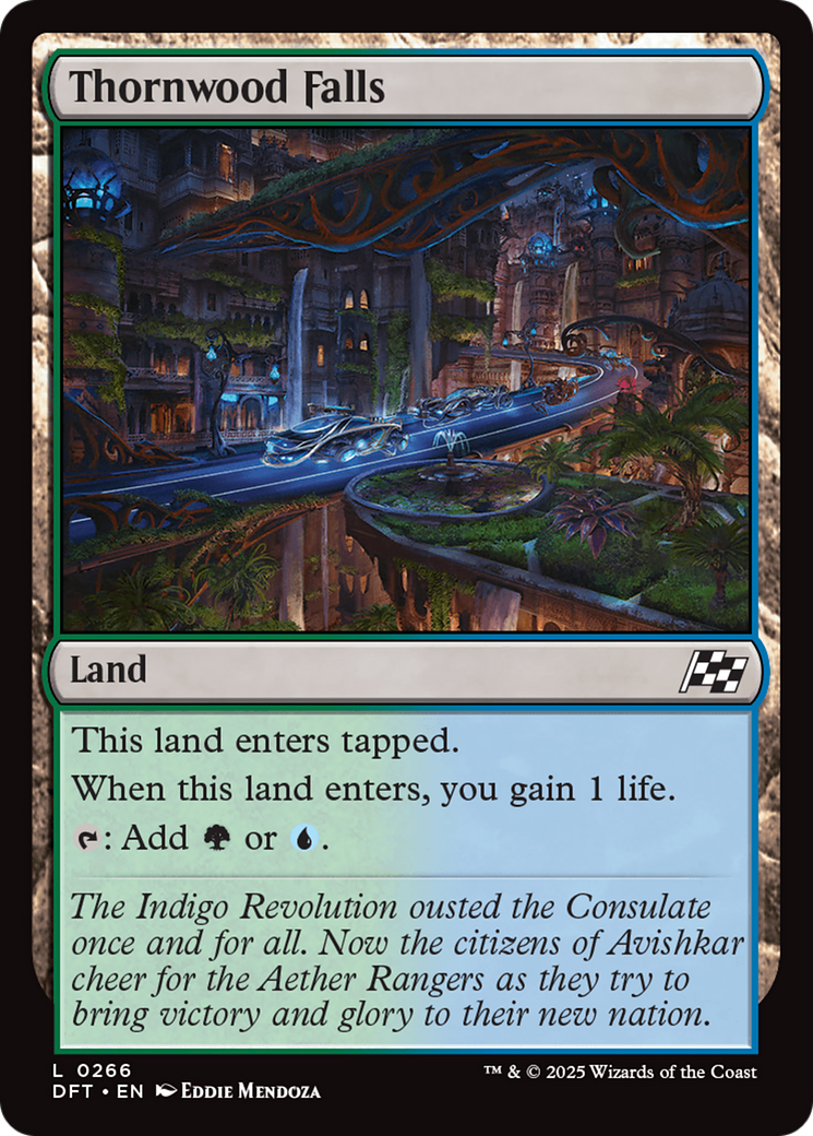 Thornwood FallsCard Type: LandCard Text: This land enters tapped. When this land enters, you gain 1 life. : Add or .Flavour Text: The Indigo Revolution ousted the Consulate once and for all. Now the citizens of Avishkar cheer for the Aether Rangers as they try to bring victory and glory to their new nation.Artist: Eddie Mendoza