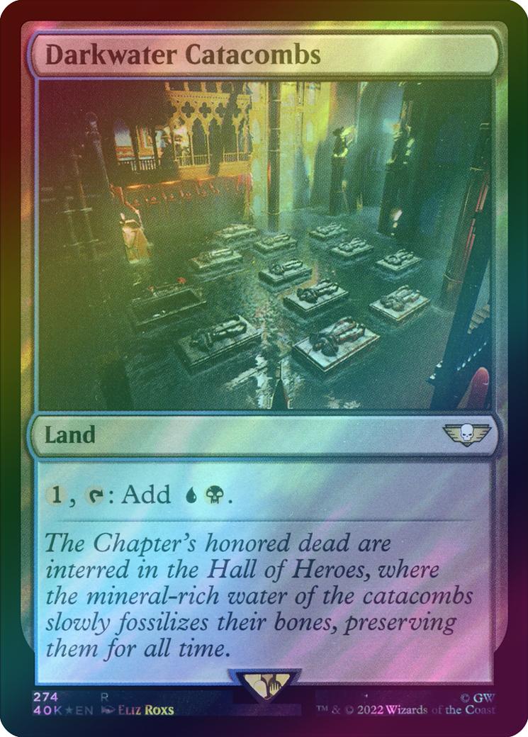 Darkwater CatacombsCard Type: LandCard Text: , : Add .Flavour Text: The Chapter's honored dead are interred in the Hall of Heroes, where the mineral-rich water of the catacombs slowly fossilizes their bones, preserving them for all time.Artist: Eliz Roxs