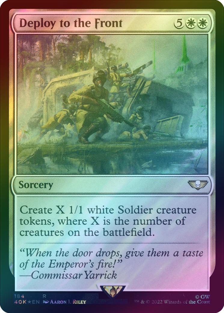 Deploy to the FrontCasting Cost: Card Type: SorceryCard Text: Create X 1/1 white Soldier creature tokens, where X is the number of creatures on the battlefield.Flavour Text: "When the door drops, give them a taste of the Emperor's fire!" -Commissar YarrickArtist: Aaron J. Riley